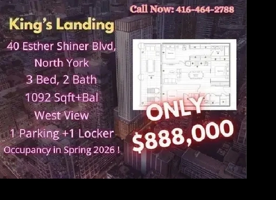 40 Esther Shiner Blvd, North York ️ 3 Bedrooms | 2 Bathrooms 1,092 sqft Balcony West-facing — bright afternoons & beautiful sunsets 1 Parking 1 Locker Located at King’s Landing, one of North York’s most desirable and fast-growing communities. Enjoy the perfect balance of urban convenience and green living ‍♀️ Steps to parks, trails, and community green spaces Minutes to Highway 401 & 404 — easy access across the GTA Close to TTC, subway stations, and major transit routes ️ Surrounded by shopping, dining, and everyday essentials Near top-rated schools — ideal for families ️ Occupancy: Spring 2026 A rare 3-bedroom condo offering space, location, and long-term value — perfect for families, professionals, or investors looking ahead. Contact Patricia today: 416-464-2788 patriciarealtyteam@gmail.com